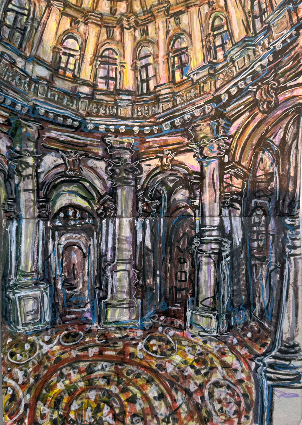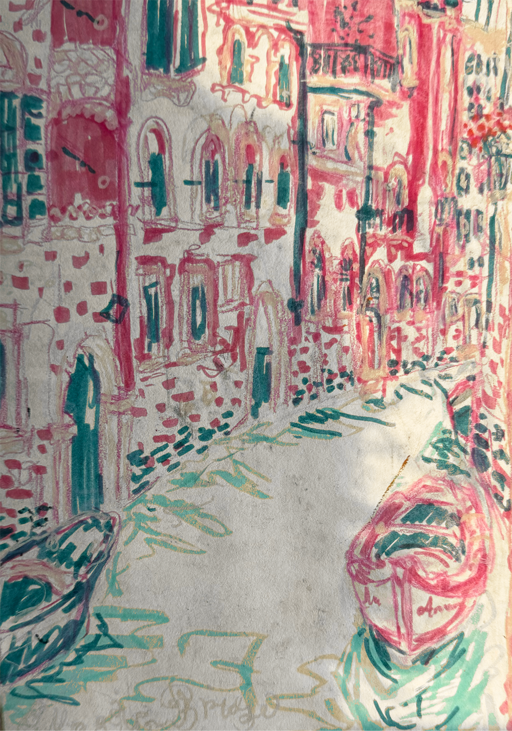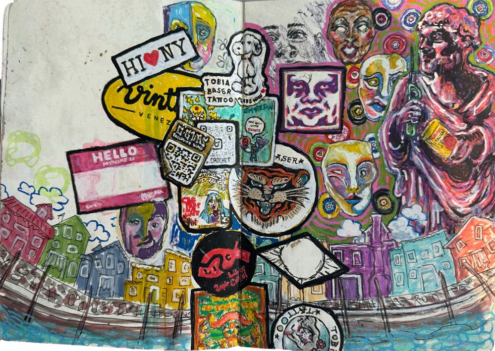Study abroad drawing class final project–multimedia inspired by Venice Biennale. Uses found items, collage, oil pastel, paint, and clay.