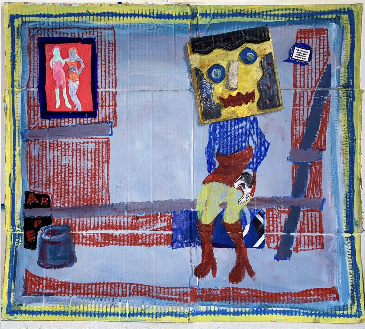 Uses found items, collage, oil pastel, paint, and clay.